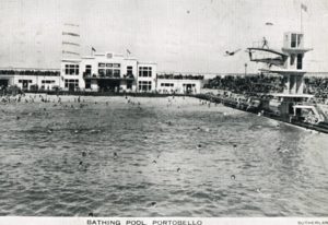 Portobello Bathing Pool, famous for its distinctive Art Deco design, lofty diving boards, artificial waves and chilly waters, was Portobello’s main attraction for over 40 years. The pool, which opened in 1936, was the largest outdoor facility of its kind in Europe. The Pool was enormous; 330 feet long by 150 feet wide – the equivalent of two Olympic sized pools – and varied in depth from one foot to six feet two inches at the deep end. Six thousand spectators could be accommodated, with 2,000 seats available under a cantilevered stand, and there were lockers provided for 1284 swimmers. The one and a half million gallons of water required to fill the pool was filtered from the sea and heated to a temperature of 68 degrees Fahrenheit by steam from the adjacent power station – though most accounts of the water temperature ranged from icy cold to sub-Siberian.