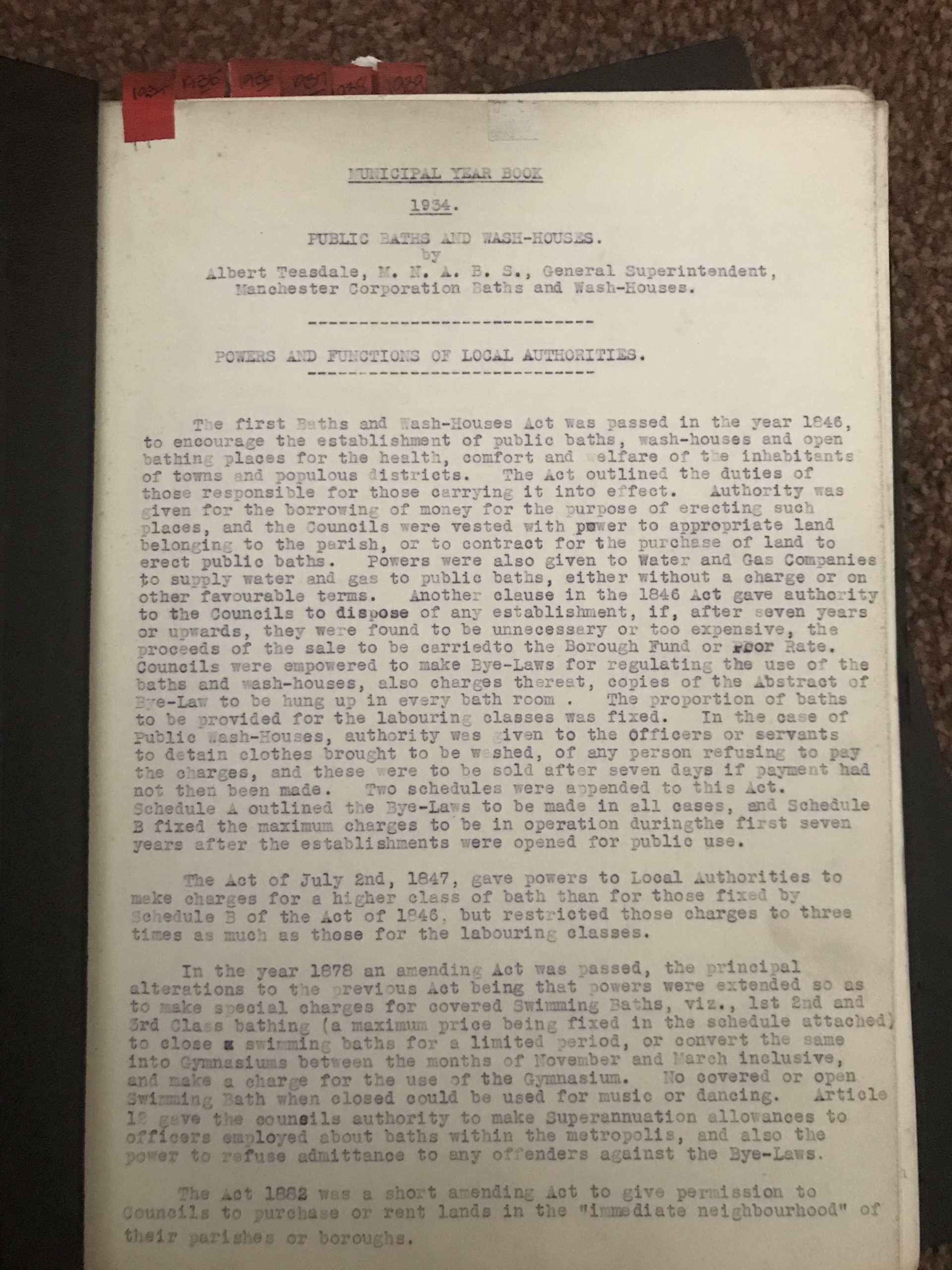 The work is available to read here. Albert Teasdale A Summarised Record of the Provision and Development of Public Baths & Wash Houses with Special Reference to Manchester