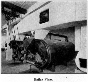 The boiler plant consists of two “Economic” independent hot –water boilers 10 ft. 6 in. long by 5 ft. 9 in. diameter, fired by automatic stokers. An induced draught fan is fitted on the smoke outlet. These boilers serve the heating apparatus, hot water supply calorifier, plenum heating battery and the swimming bath water heater.