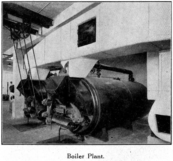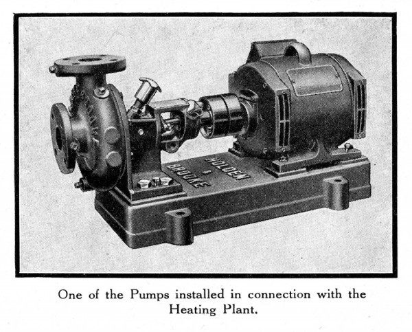 In connection with the heating plant two 3 in. pumps and one 1 in. pump are installed. These pumps are of the end suction single-stage type. The impellers, which are hydraulically and mechanically balanced are cast in special bronze, and the shaft, which is of stainless steel is carried in a long and substantial journal bush bearing.