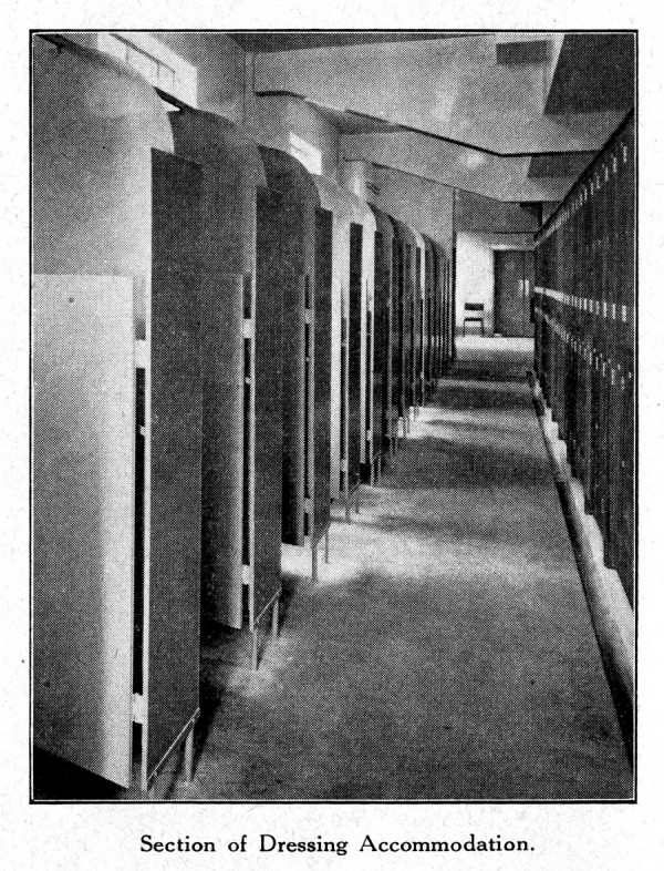 The dressing rooms are two in number and provide 28 Plymax standard dressing cubicles- for each sex. Plymax is plywood faced with metal and the material is particularly resistant to damp conditions and damage. In this instance the metal used is steel subsequently painted. Provision is made for 312 bathers, the lockers accommodating the well-known “Hyg-gard-all” compact clothes hangers.
