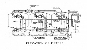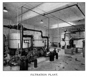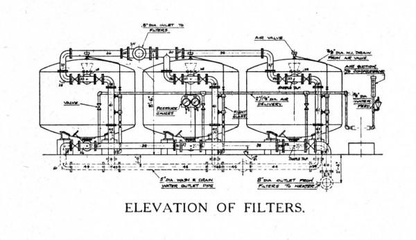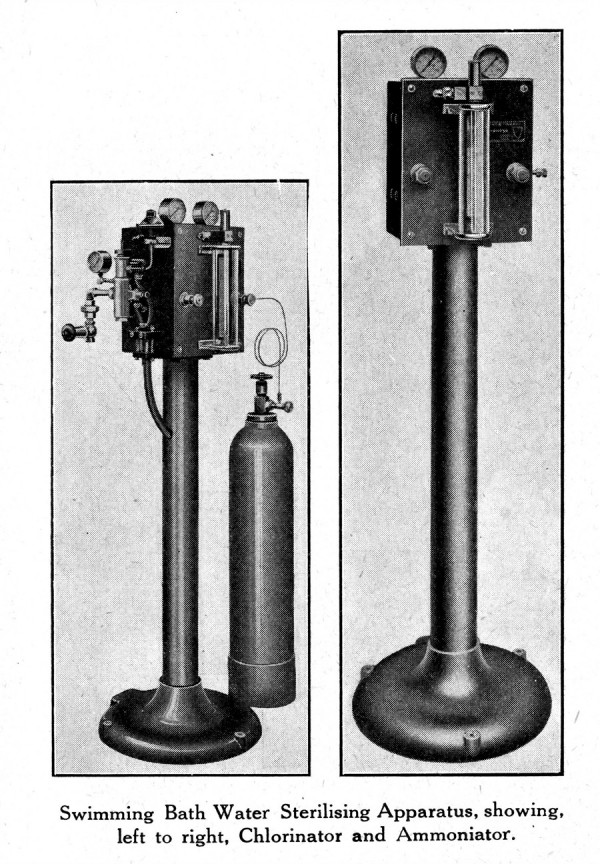The plant for the continuous circulation and filtration of the swimming bath water is capable of dealing with 38,210 gal, per hour, giving a complete circulation of the whole of the contents of the bath once every four hours. The plant comprises : Electrically driven pumps, shunt feed chemical apparatus, vertical type air scoured pressure filters, compressor and motor, and the necessary circulating piping, connecting the plant to and from the bath, including suction grid and frame built into the deep end of the bath and specially designed “Bell” type inlet, at the shallow end of the bath. The installation also includes a chlorination apparatus for the sterilisation of the water.
