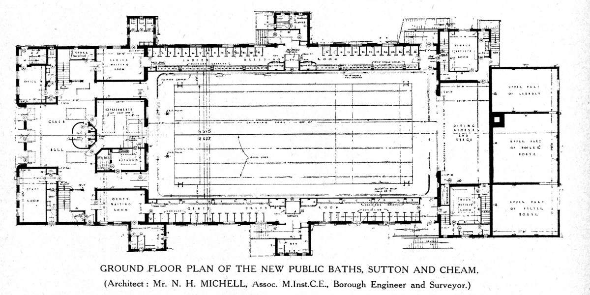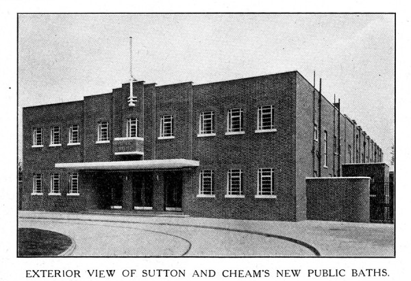 EVEN at first sight the new baths opened by the Mayor, Ald. Grahame R. Glegg, J.P., in Malden road, Cheam, on April 9. make it apparent that success has attended the enterprise of the borough engineer and surveyor of Sutton and Cheam, Mr. N. H. Michell, Assoc.M.Inst.C.E., chartered civil engineer and registered architect, who designed and supervised the erection of the building, assisted by Mr. T. Wilson and Mr. H. Thornley, of his department. The preliminary sketch plans were prepared by Mr. W. Hedley Grieves, who retired from the position of engineer and surveyor in 1934.