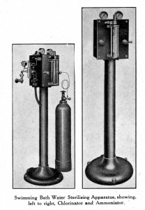 Before being returned to the shallow end of the bath the water is chlorinated and is also passed through the heater which maintains the temperature at 74 deg. Fahr.