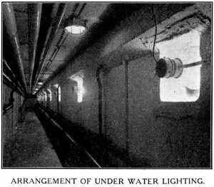For the underwater lighting eighteen 500 watt projectors are used equipped with special prismatic reflectors. Around the bath a number of cast bronze built-in units are installed for lighting the floor. These built-in units are equipped with 60 watt lamps.